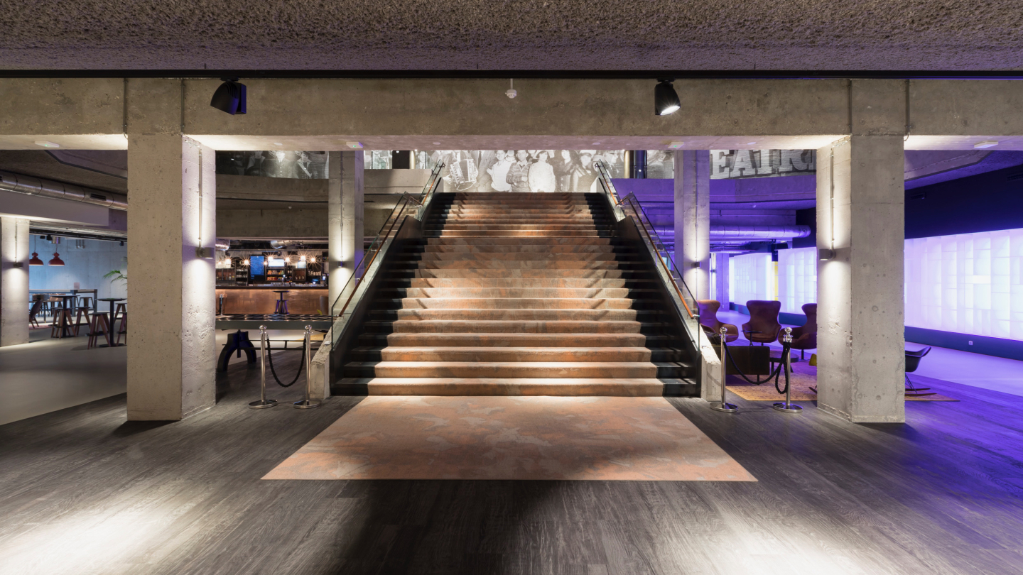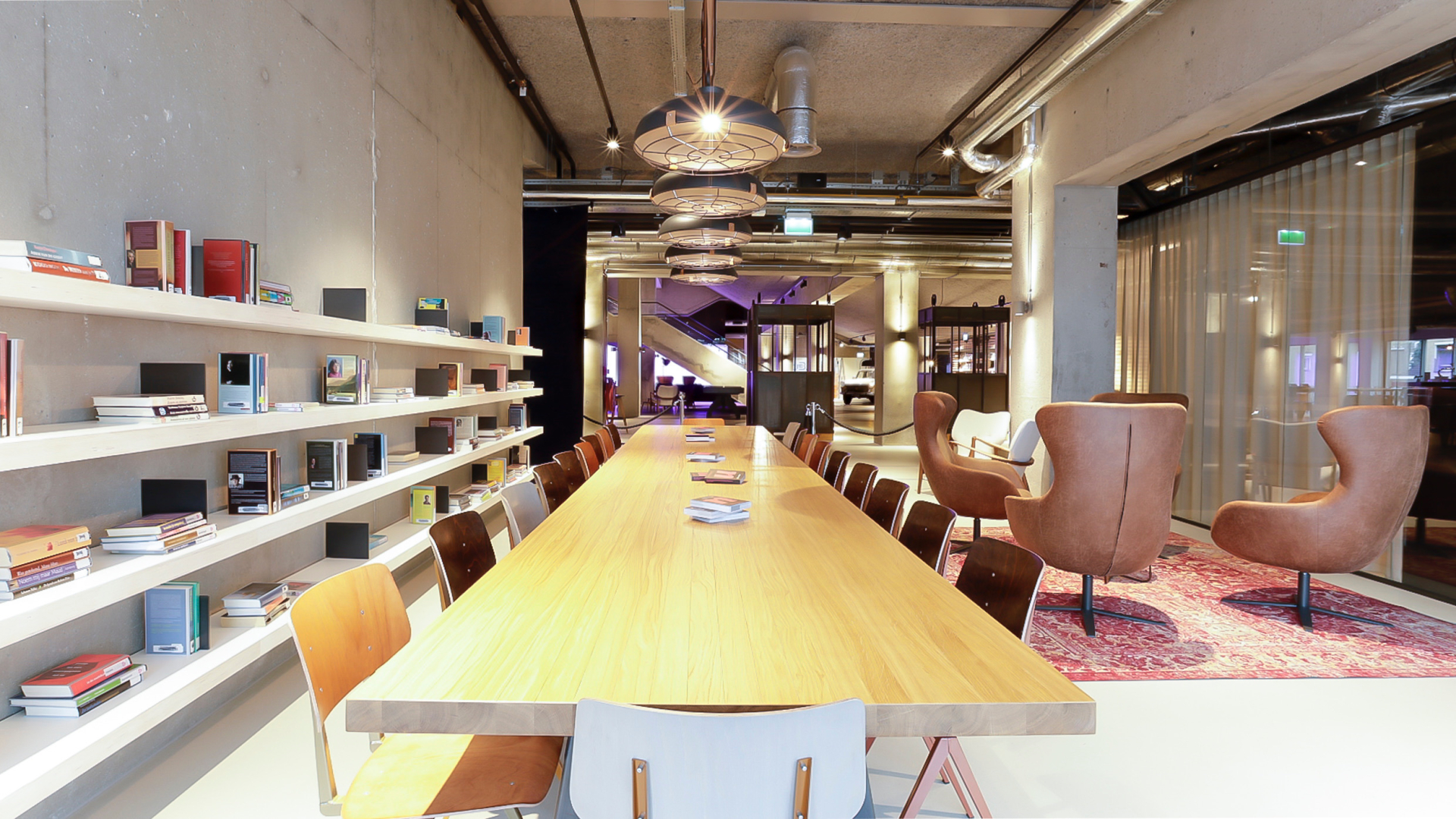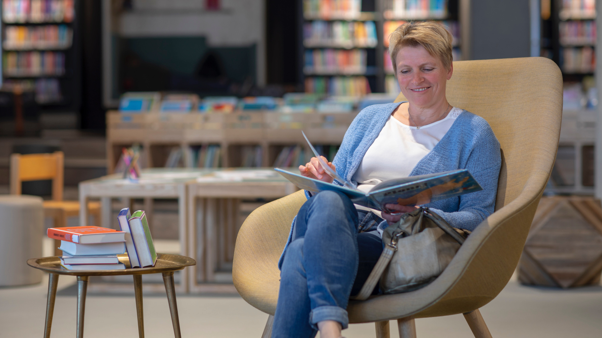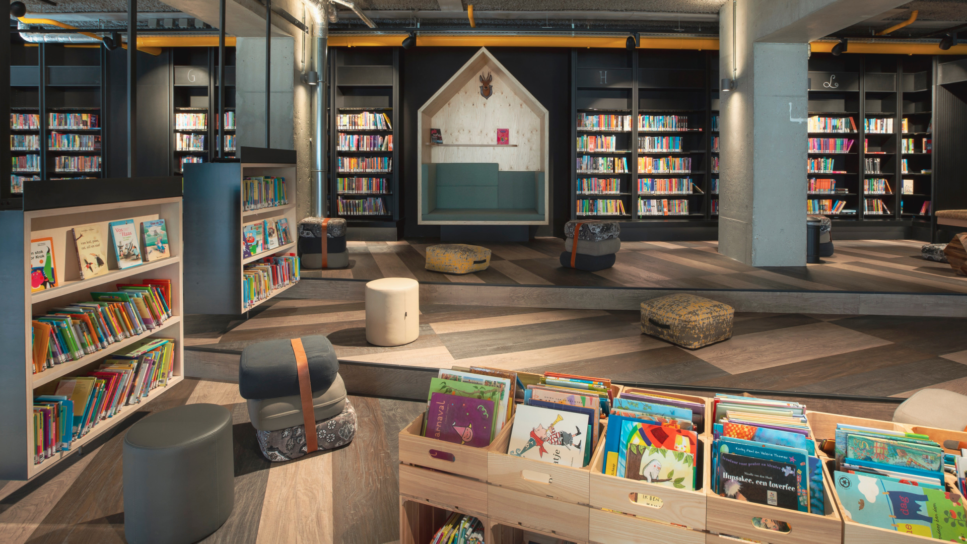 Der Eyecatcher dieses Raumes befindet sich im Foyer: Die Theatertreppe ist mit einem wunderschönen Handlauf und einem rötlich-pinken Teppich ausgestattet. Die Bibliothek ist buchstäblich und figurativ durch das Gebäude gewoben. Vom Eingang bis zur Kinderabteilung sind die verschiedenen Räume kontinuierlich durch ein langes Bücherregal miteinander verbunden. Wie auch im Rest des Gebäudes finden sich in den Bibliotheksabschnitten subtile Hinweise auf die Geschichte des Kohlebergbaus in der Region. Zum Beispiel dienen maßgeschneiderte Kohlebergbaulifte als Lesehütten und ein alter Hanomag-Truck eignet sich perfekt als Empfangsbereich für Gruppen.