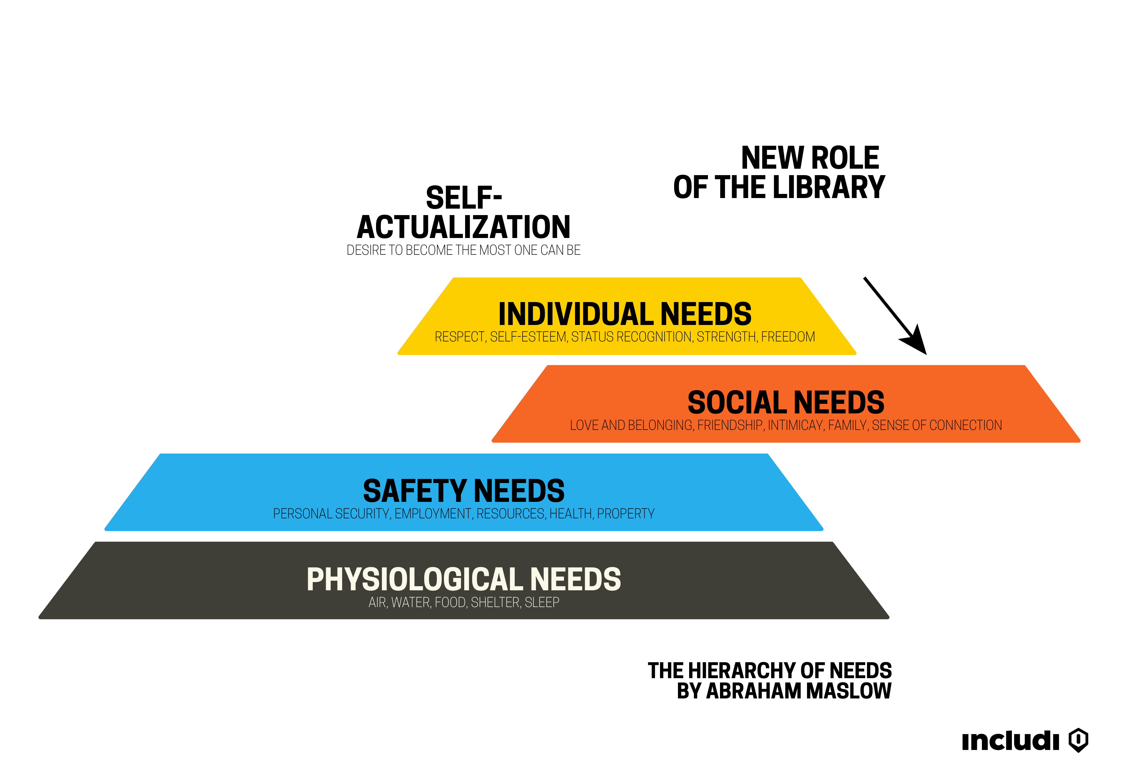 Some of the cultural institutes that libraries are known to be are open to change. With Maslow in mind, they are shifting to more elementary needs and playing a new key role in modern society. Being both a physical and social place, they are able to address another level of Maslow’s pyramid – they provide people with a sense of belonging.