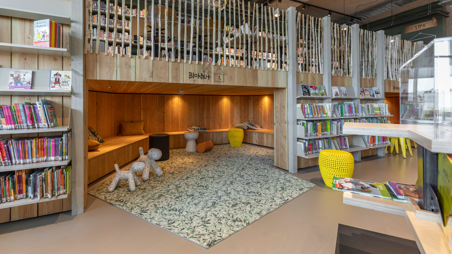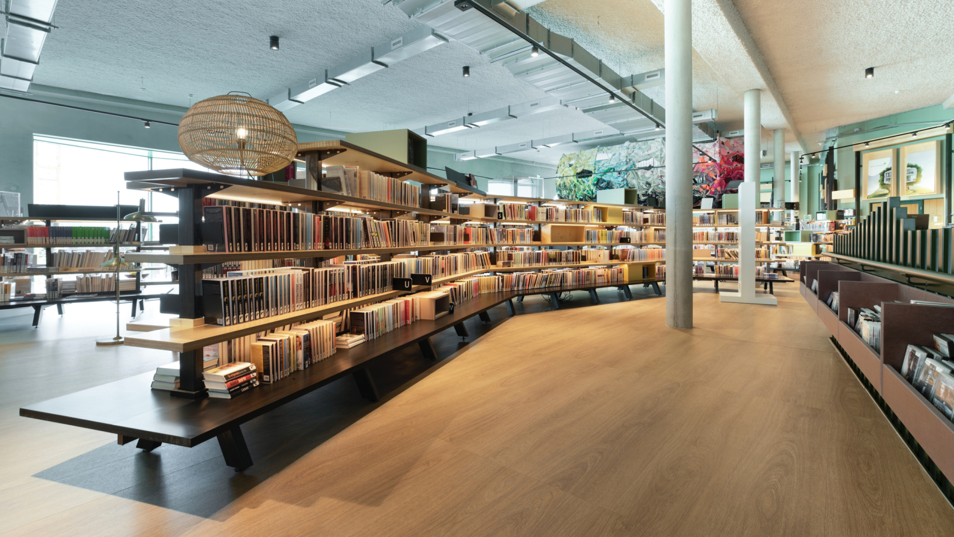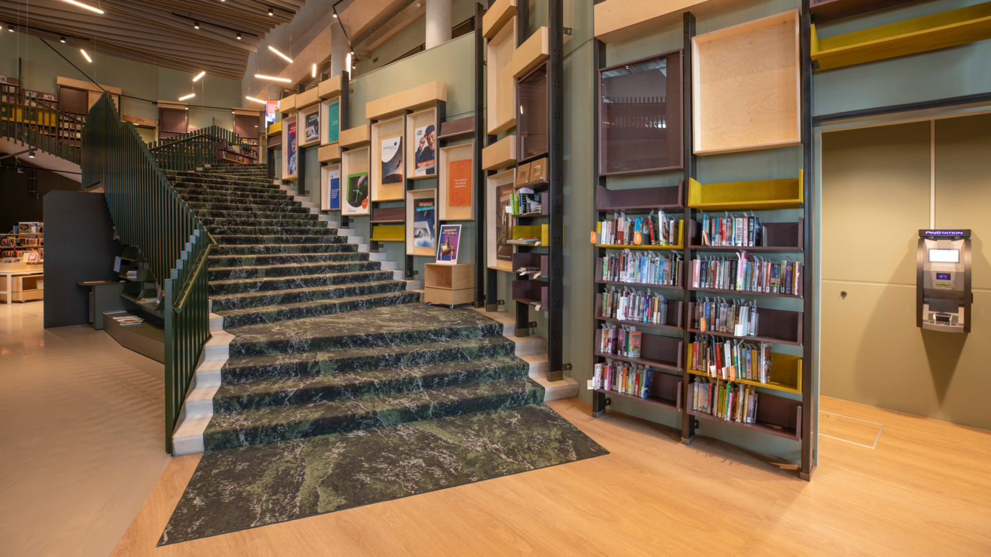 De bibliotheek moedigt spontane ontmoetingen en persoonlijke ontwikkeling aan. Een bewust imperfecte lay-out creëert een toegankelijk, informeel interieur dat persoonlijk aanvoelt. Om het groene karakter van zowel de stad als het duurzame gebouw te versterken, zijn er veel groene accenten en natuurlijke materialen gebruikt in het interieur om een parkachtig karakter te creëren. Een flinke portie natuurlijk licht nodigt mensen uit om dit bos van verwondering te verkennen. De kasten zien eruit als takken die willekeurig in de ruimte liggen, de trap is bedekt met een mosgroen tapijt. Een wand met houten lambrisering herbergt bibliotheekfaciliteiten en open zithoeken die bezoekers verwelkomen om te lezen, elkaar te ontmoeten of een gesprek aan te gaan. Al deze unieke elementen maken van de nieuwe bibliotheek een aangename derde plek met een versterkte sociale rol.