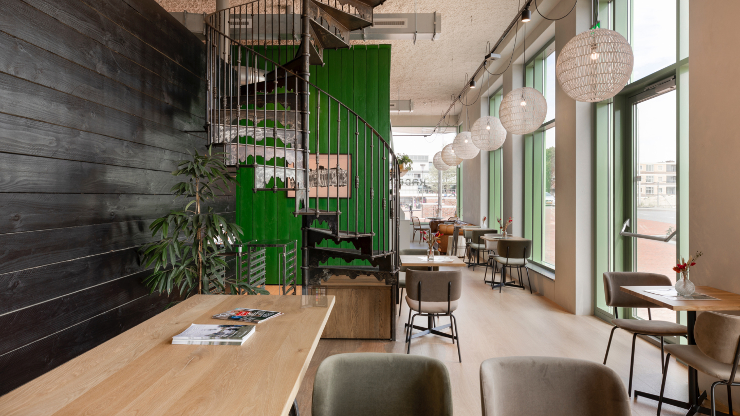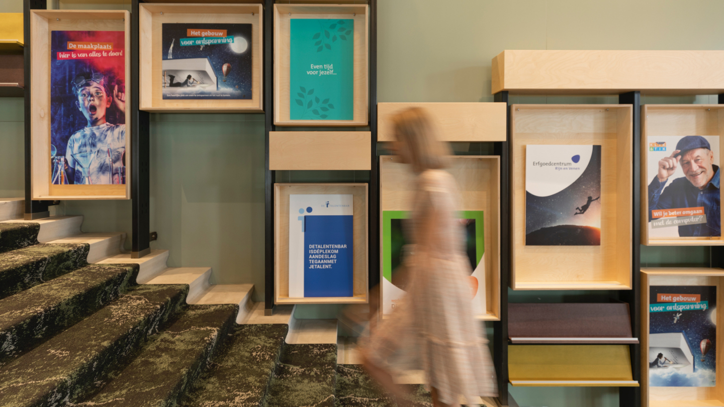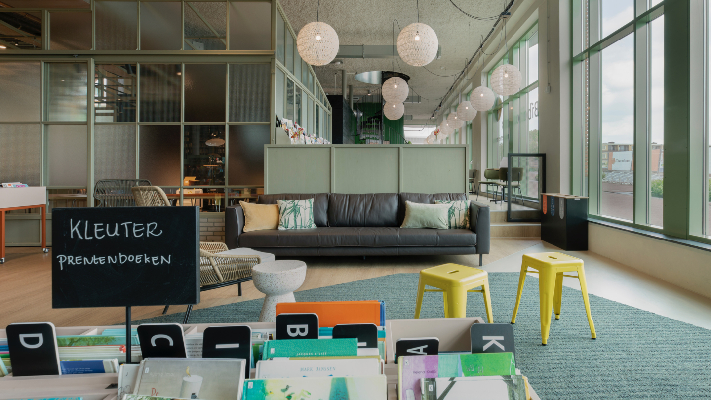 De ruimtelijke compositie van de imposante trap, kozijnen en kolommen, evenals het ‘groene’ karakter zoals ontworpen door Common Affairs, vormden al een sterke basis voor het interieurontwerp. De nodige diepgang in het interieurconcept verkregen we echter uit de relevante inzichten die we opdeden tijdens een reeks workshops met het bibliotheekteam en lokale belanghebbenden. Zo vormt de trap in het hart van het gebouw samen met de aangrenzende kastenwand een ‘groen lint’ dat de twee verbindt en een organisch vloerplan creëert. Binnen deze plattegrond bevinden zich verschillende ‘ankers’, zoals een leescafé (KADE 10), een activiteitenruimte die door de bibliotheekgebruikers kan worden geprogrammeerd, een historisch archief, een e-lab (‘De Maakplaats’) en een kunstwerk genaamd ‘Het Nest’.