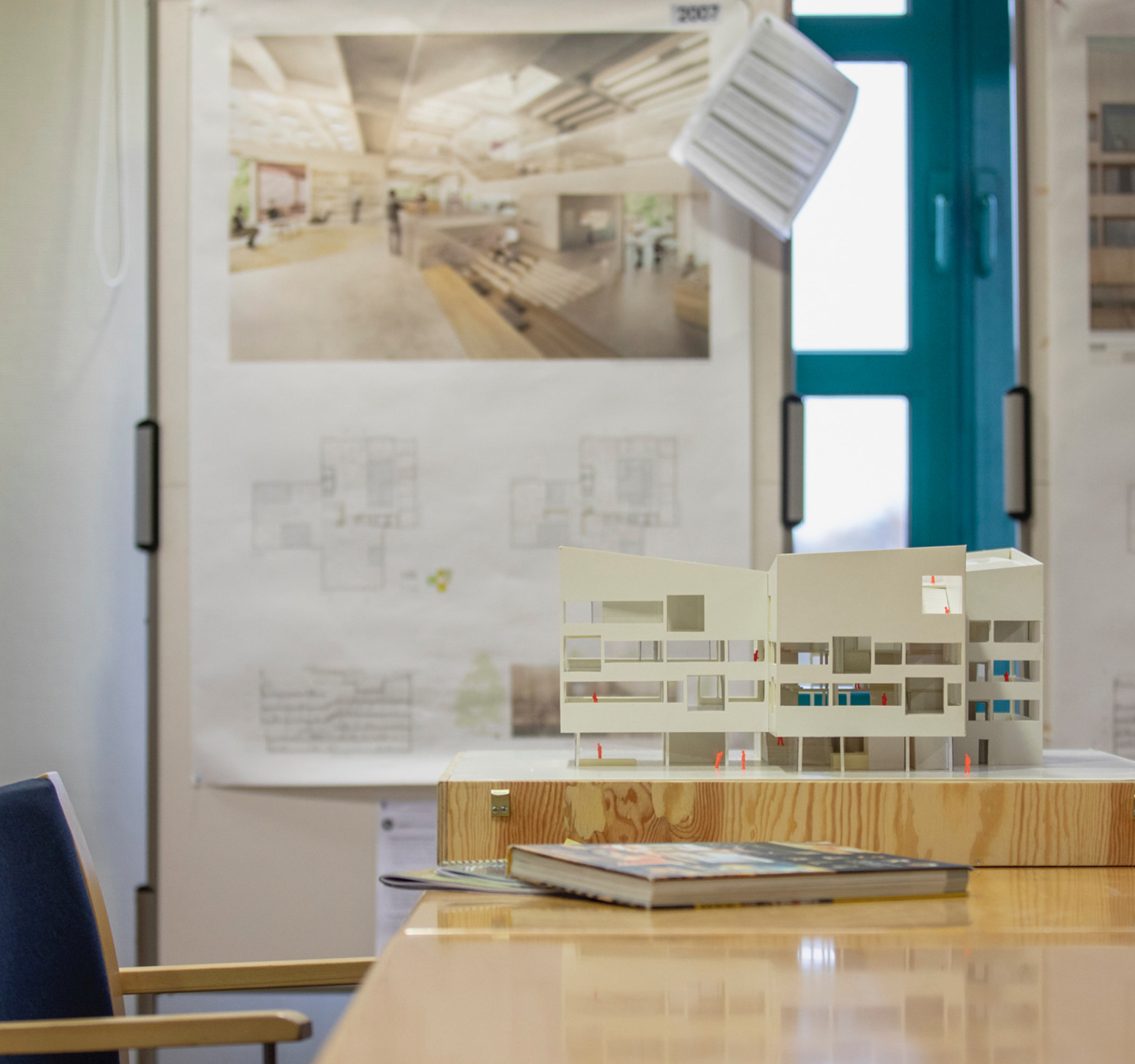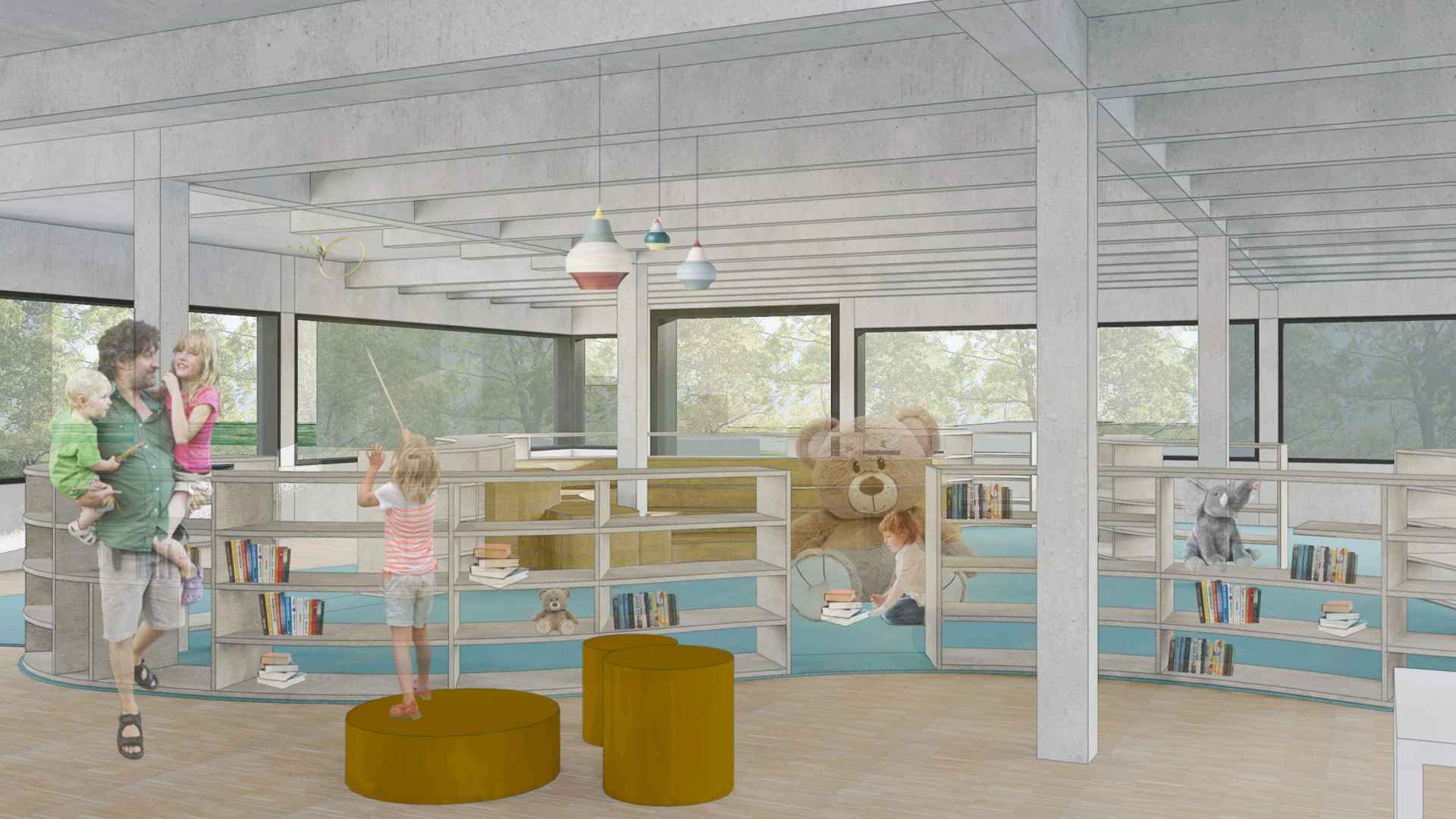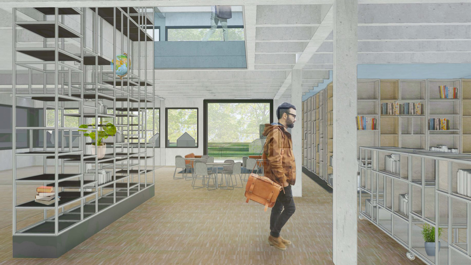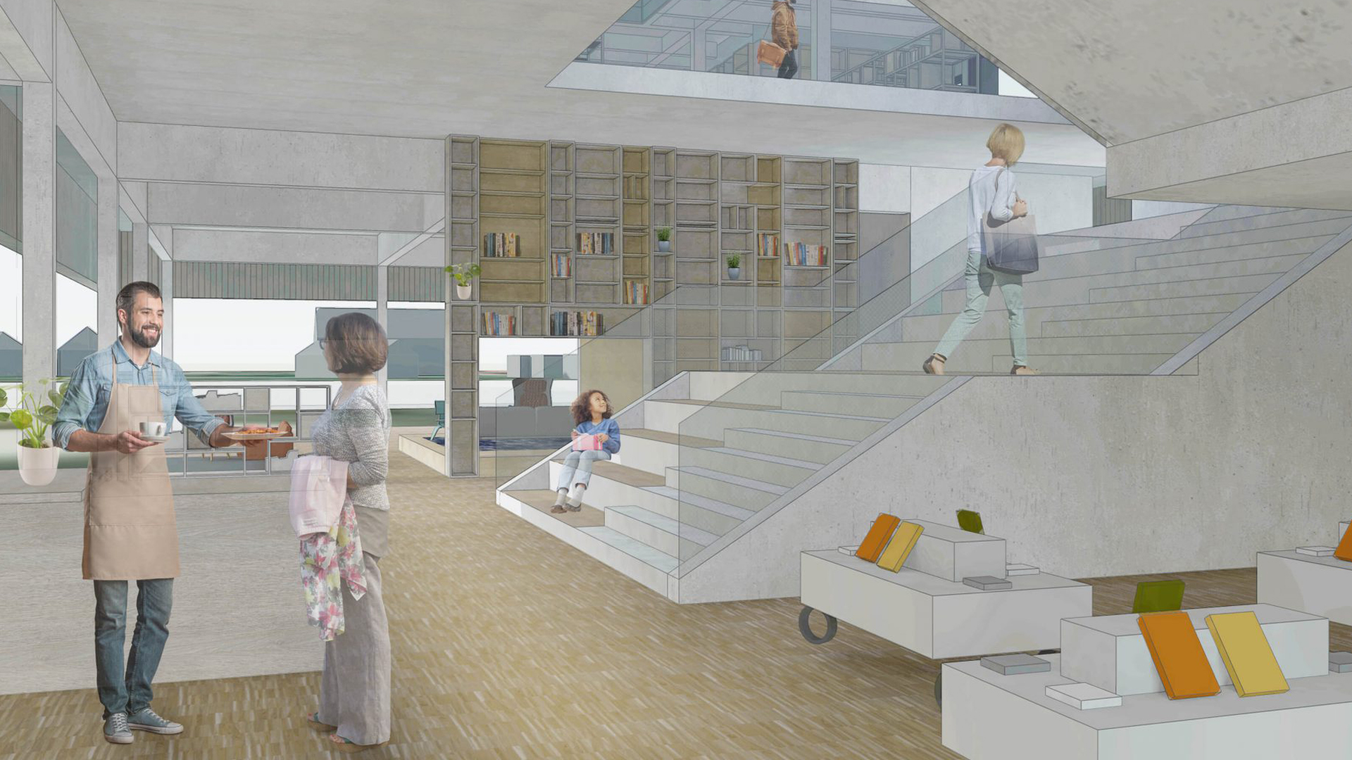 While the temporary abstract name ‘Bildungshaus’ reflects the political and administrative origins of the idea, the stakes are high for the Haus itself. No dullness is expected here: the hybrid Haus aims to become a melting pot of people, experiences, skills, learning processes and information, all gathered around a decent cup of coffee at the in-house café, intermingling on the various stairs connecting the split-level design.