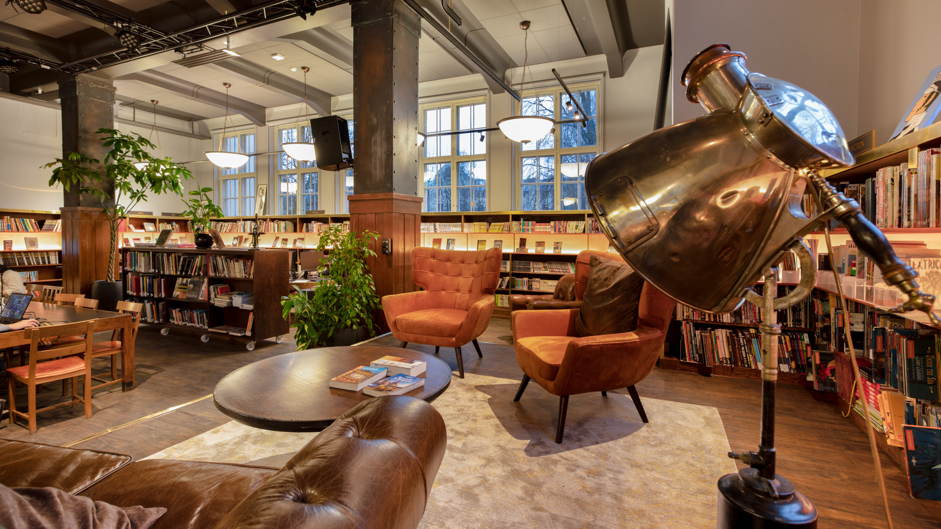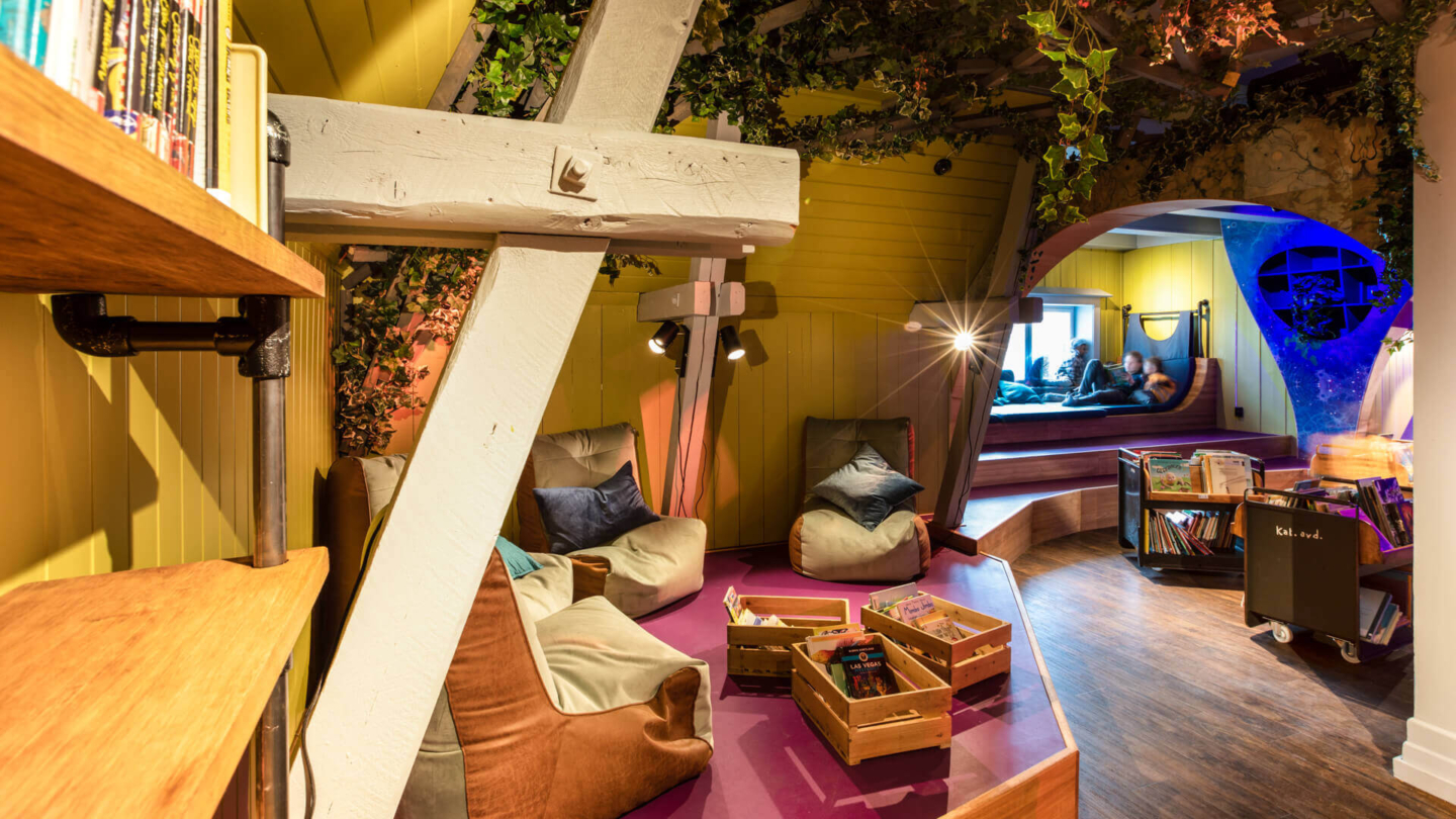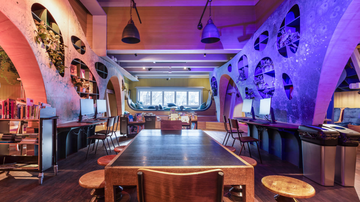 The revised library of Grünerløkka offers cozy lounge corners with vintage furniture that is easy to move or remove, allowing a smooth transition from ‘work mode’ to ‘event mode’. A massive information desk can be transformed into a bar. The first floor holds a workshop space, stage area and a new colorful kids area combining imagination and experience with the ‘interior of a Victorian sci-fi melting pot’. Wall sections with a wave-like construction flow into the room and can be used as a display or to store visitors’ belongings. With a vast array of possibilities for guests of any age, Grünerløkka Library invites locals to use its tools to engage with their community in this inclusive, welcoming third space.