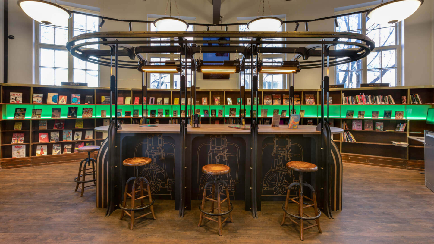 Despite its traditional appearance, Grünerløkka Library has foreign origins. The Deichman library director was inspired by Carnegie libraries during a U.S. trip and implemented the concept in Grünerløkka. It became Norway’s first Carnegie-style library. Although a new design was planned for Grünerløkka, original monumental elements of the building were to be maintained. The goal was a balance between the original and revised version; it was time to rethink tradition. In addition, the architectural task was to seamlessly implement universal access items (such as toilets and elevators for differently-abled persons) and also accommodate Norway’s largest collection of comics.