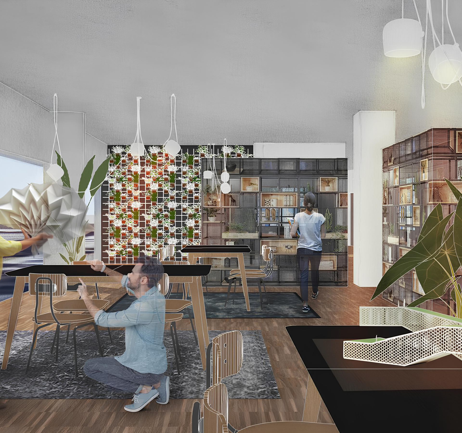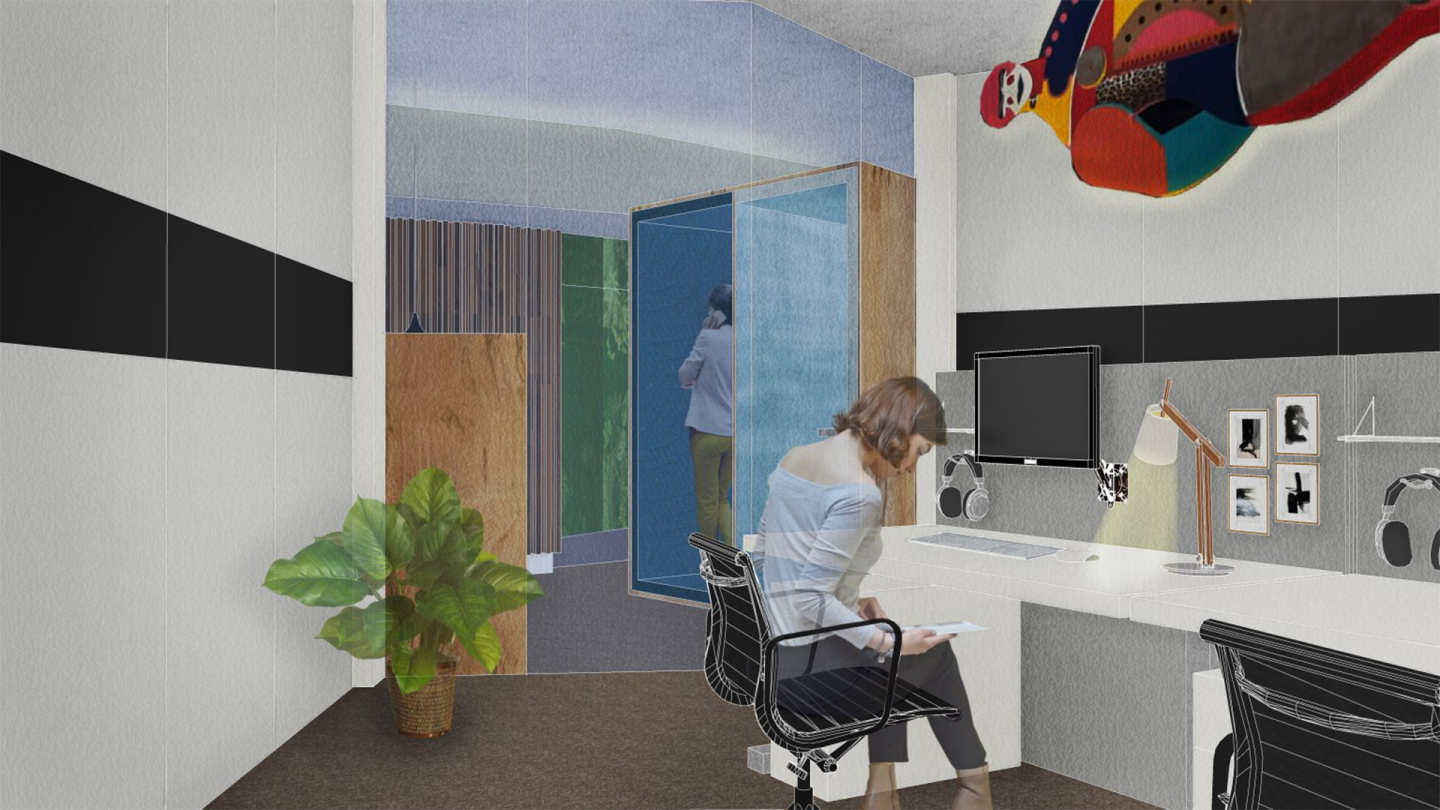 Transforming the first and second floors addresses the need for interactive spaces, concentrating social areas at lower levels. A coffee bar, merging with a front desk, becomes a central social hotspot, enhanced by new stairs for improved accessibility. Lower floors buzz with activity, while tranquil spaces are strategically placed throughout. Medium-sized meeting and gathering zones, customizable workspaces and visually distinct areas for different functions are introduced. The warm color palette, inspired by our Card Games and user feedback, reflects the desired look & feel, creating a welcoming environment tailored to users’ needs.