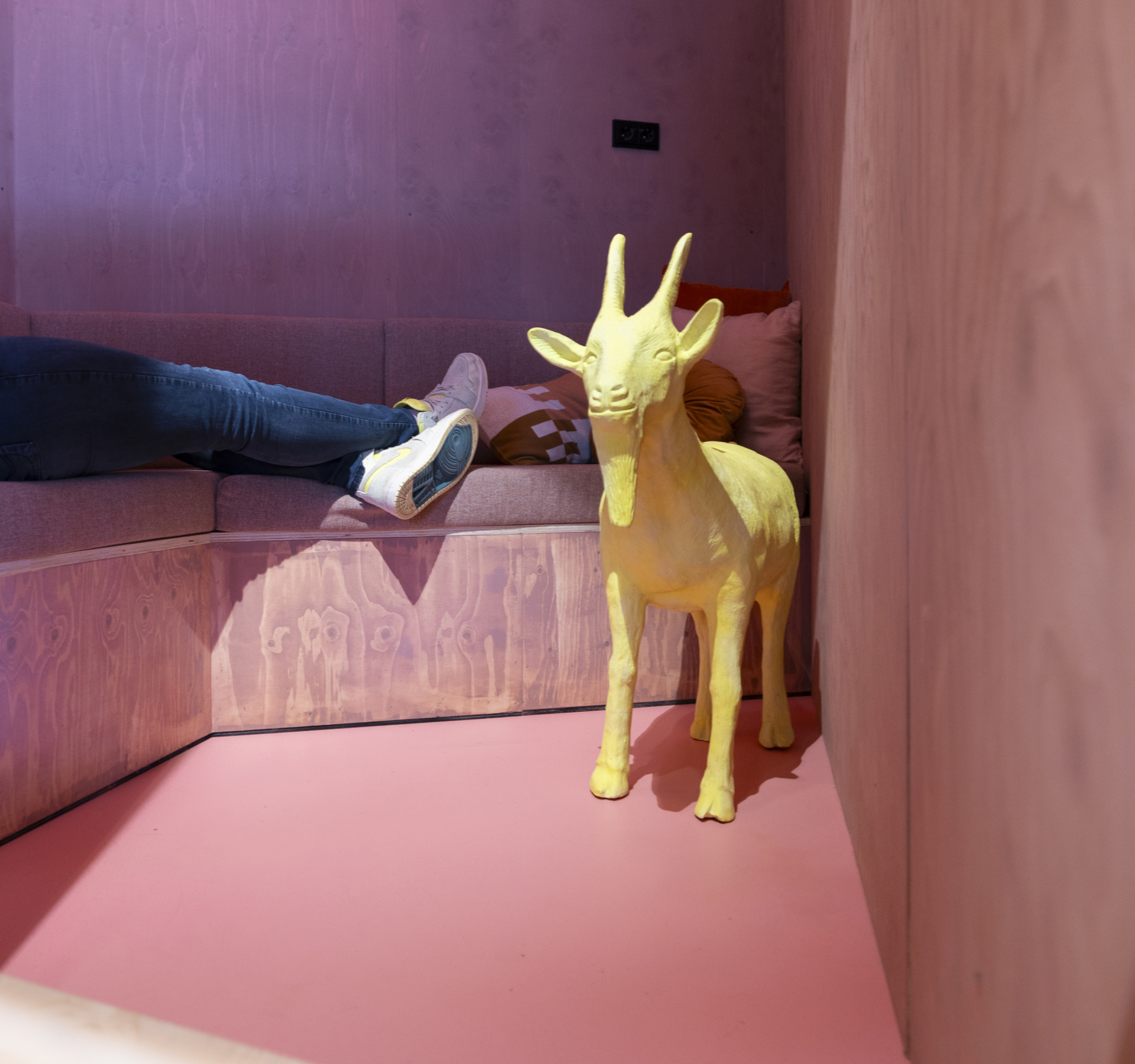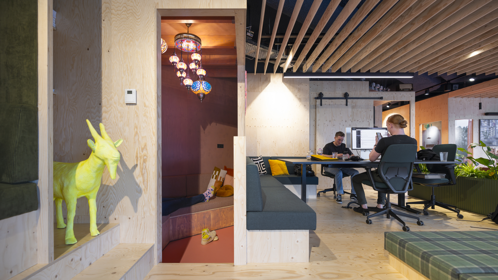 Our mascot, the office goat Dirk, appears in various places in the interior, not only as a sculpture, but also in the prints of the carpets and in the design of the shuffleboard.