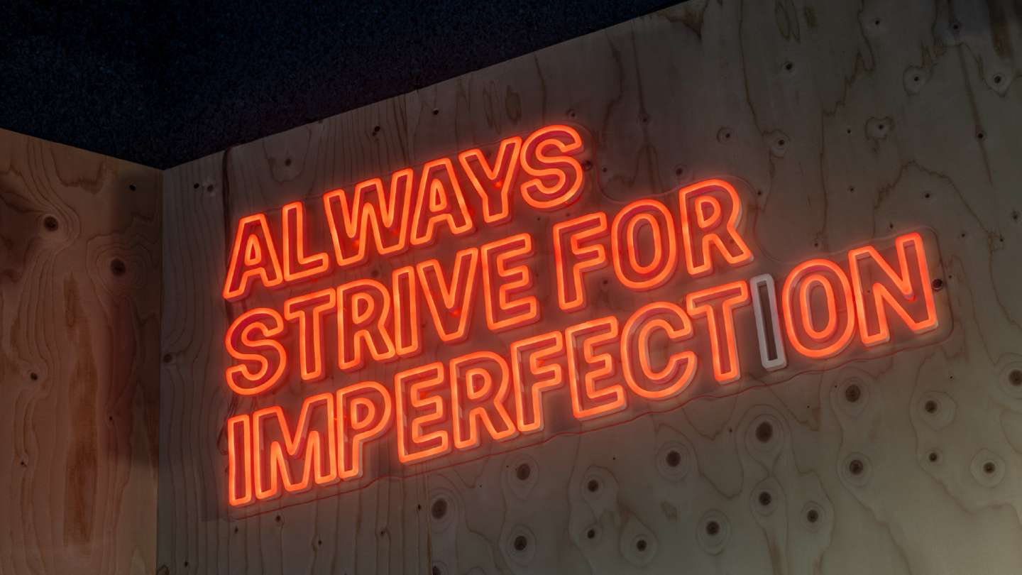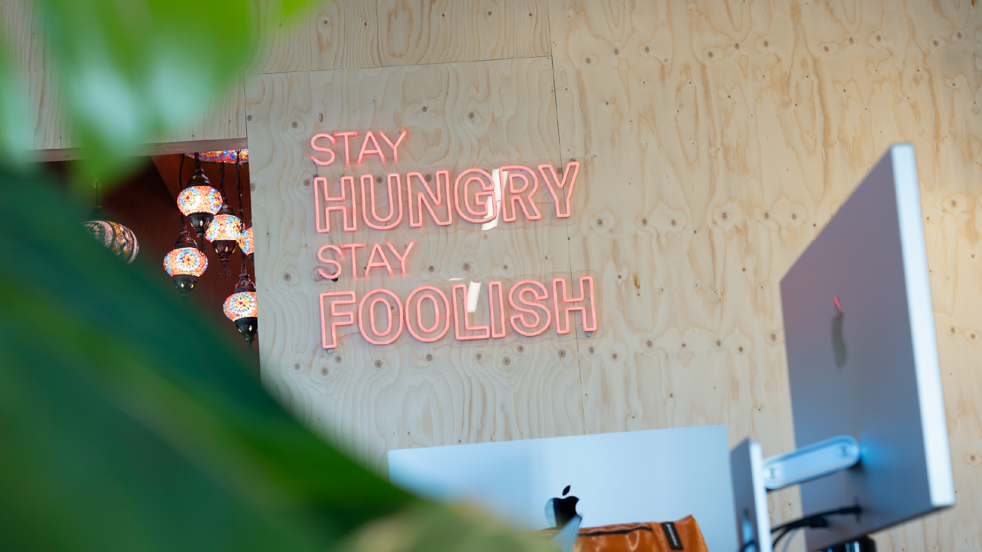 • Neon signs with our credos "Stay Hungry, Stay Foolish," "Always Strive For Imperfection" and "Assumption is the Mother of all Fuckups" are prominent elements in the interior.