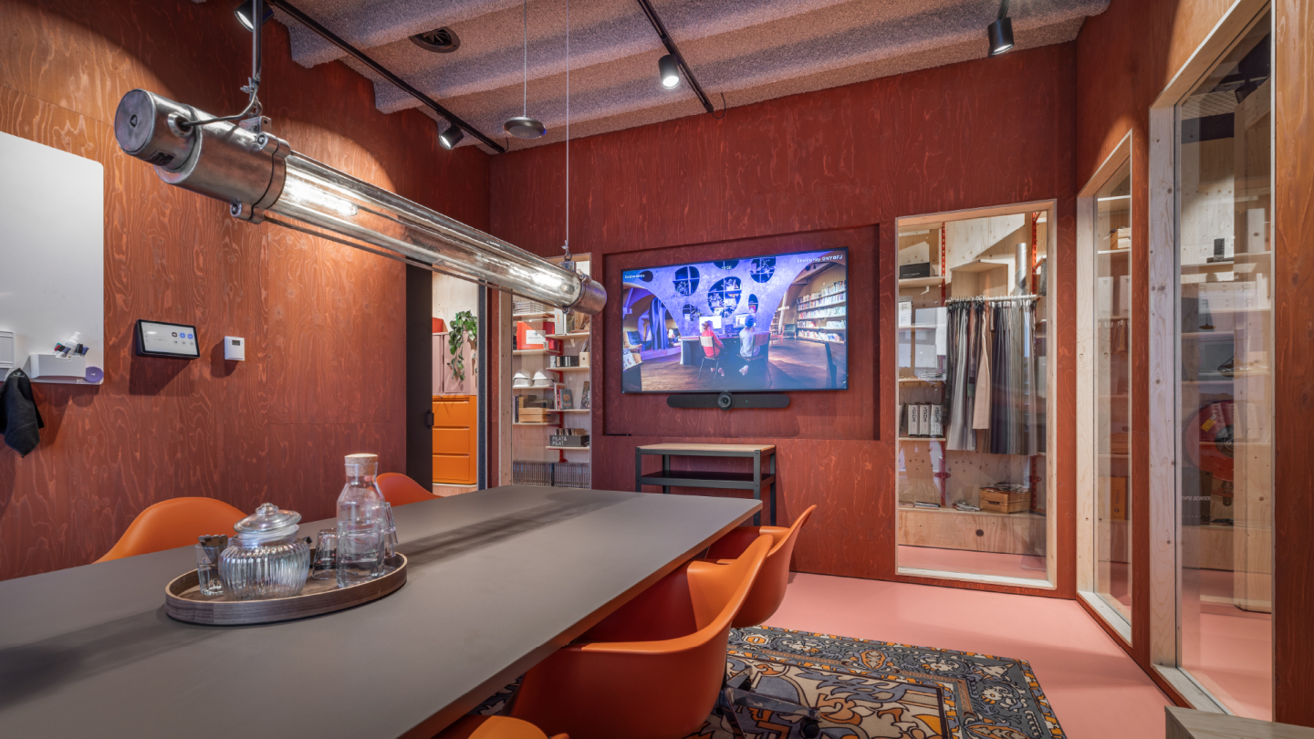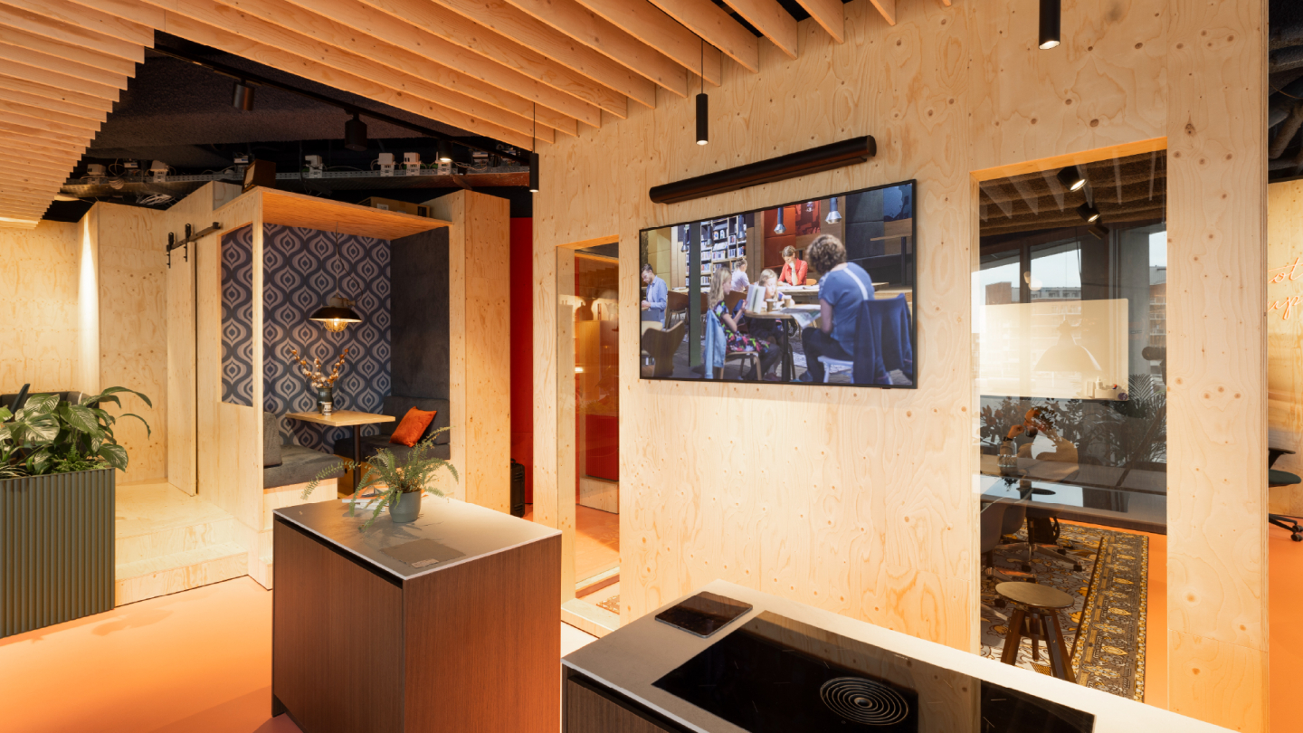• There are screens in various places that display photos of includi projects, giving a colorful view of the portfolio and adding to the cozy atmosphere.