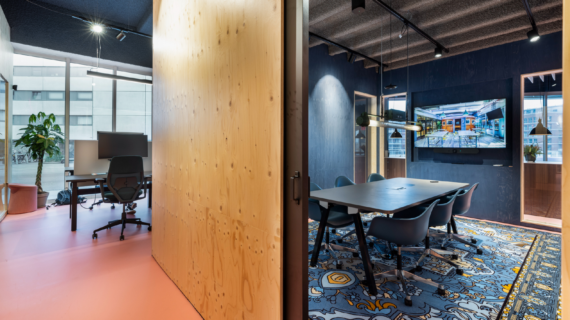 • The acoustic blue ceiling and pink coating floor function as connecting elements.