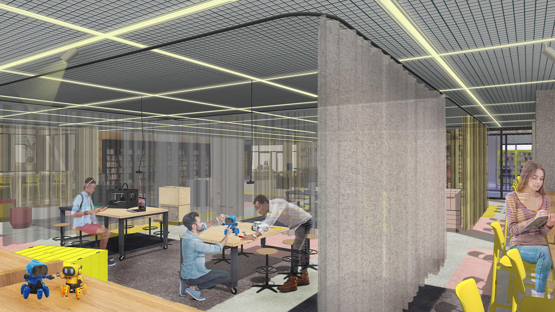 • The Makerspace on the third floor immediately catches the eye with its bright yellow colors.
