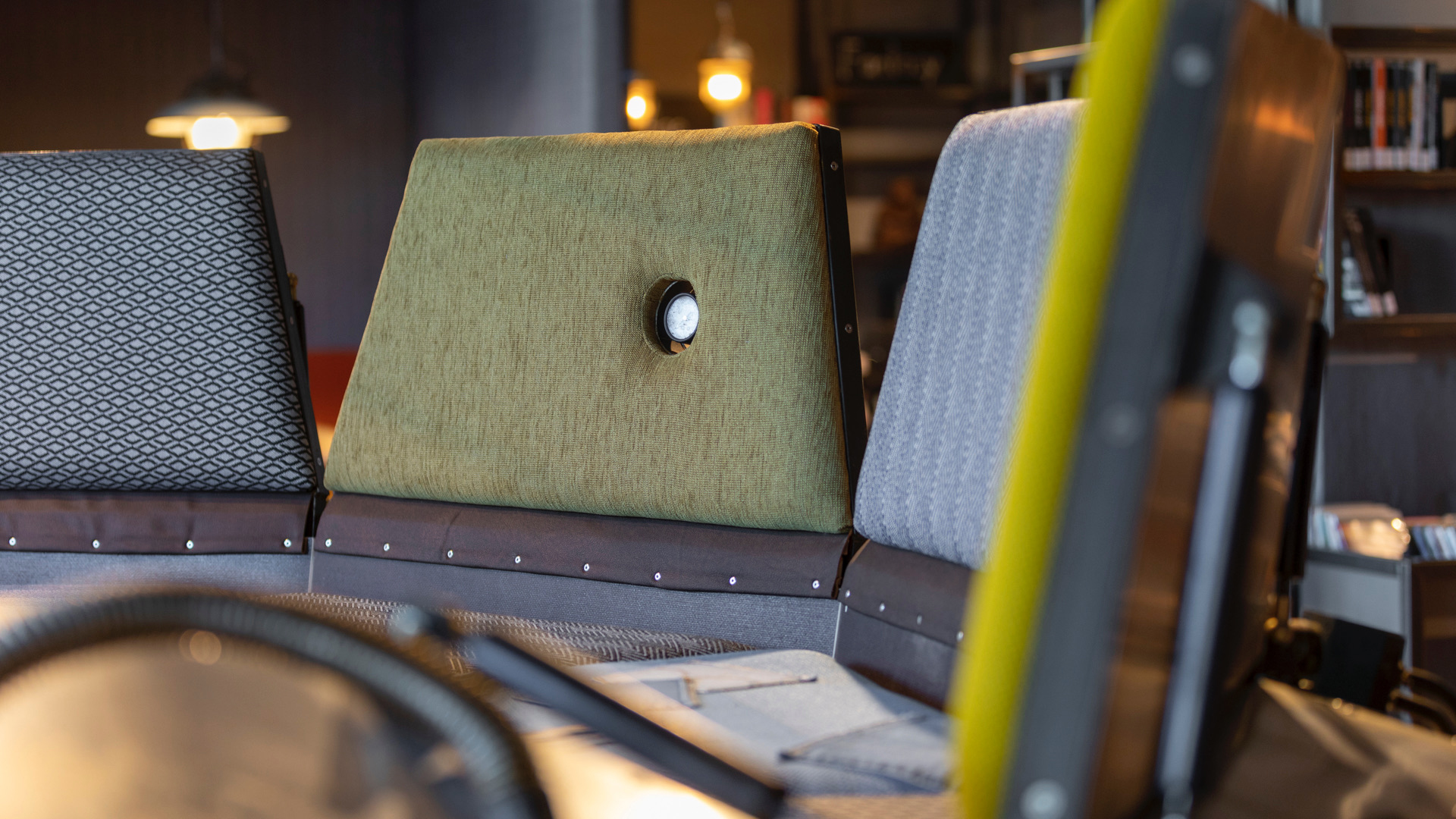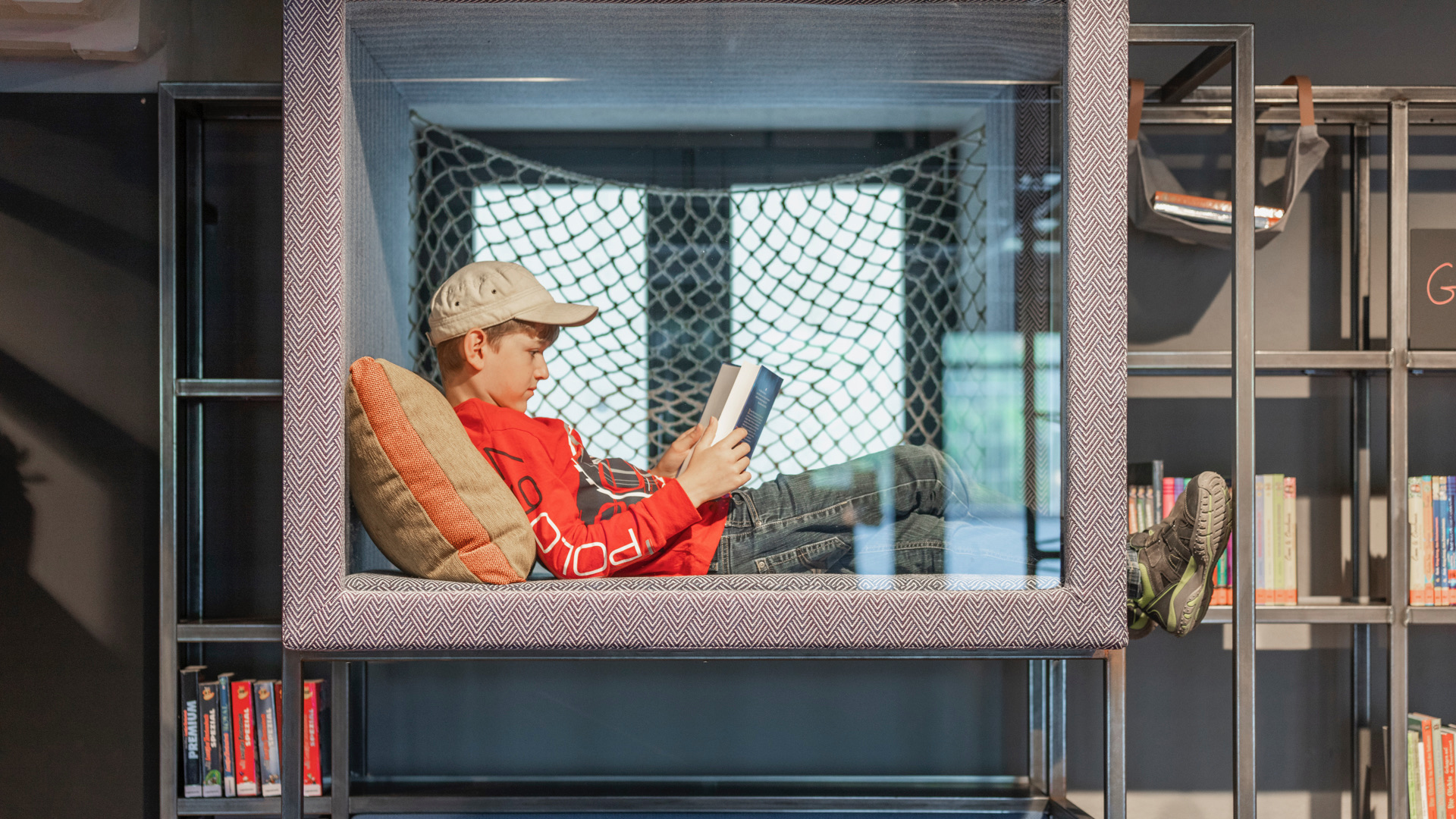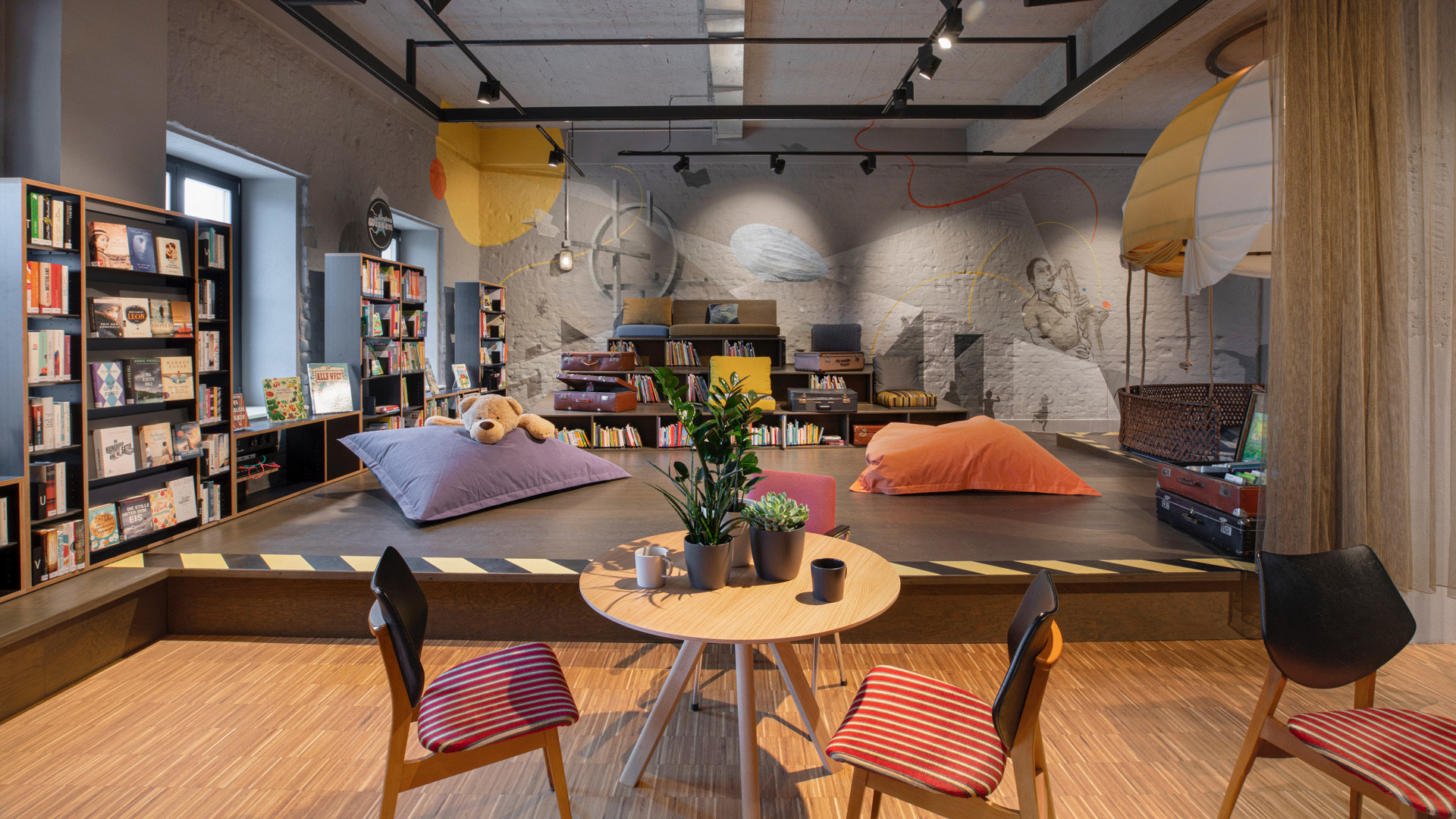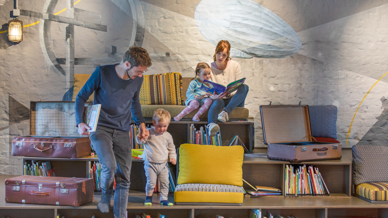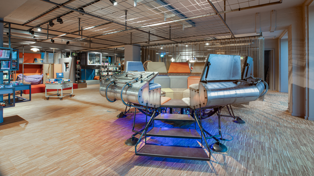 Design features in the library playfully wink at Hubland’s US Army and aircraft roots. Three eye-catching ‘specials’ include: a coffee car in a luggage vehicle on the ground floor, designed as a central meeting point, a life-size air balloon for kids to hide in and a piece of custom craftsmanship… a massive UFO for gatherings in the basement.