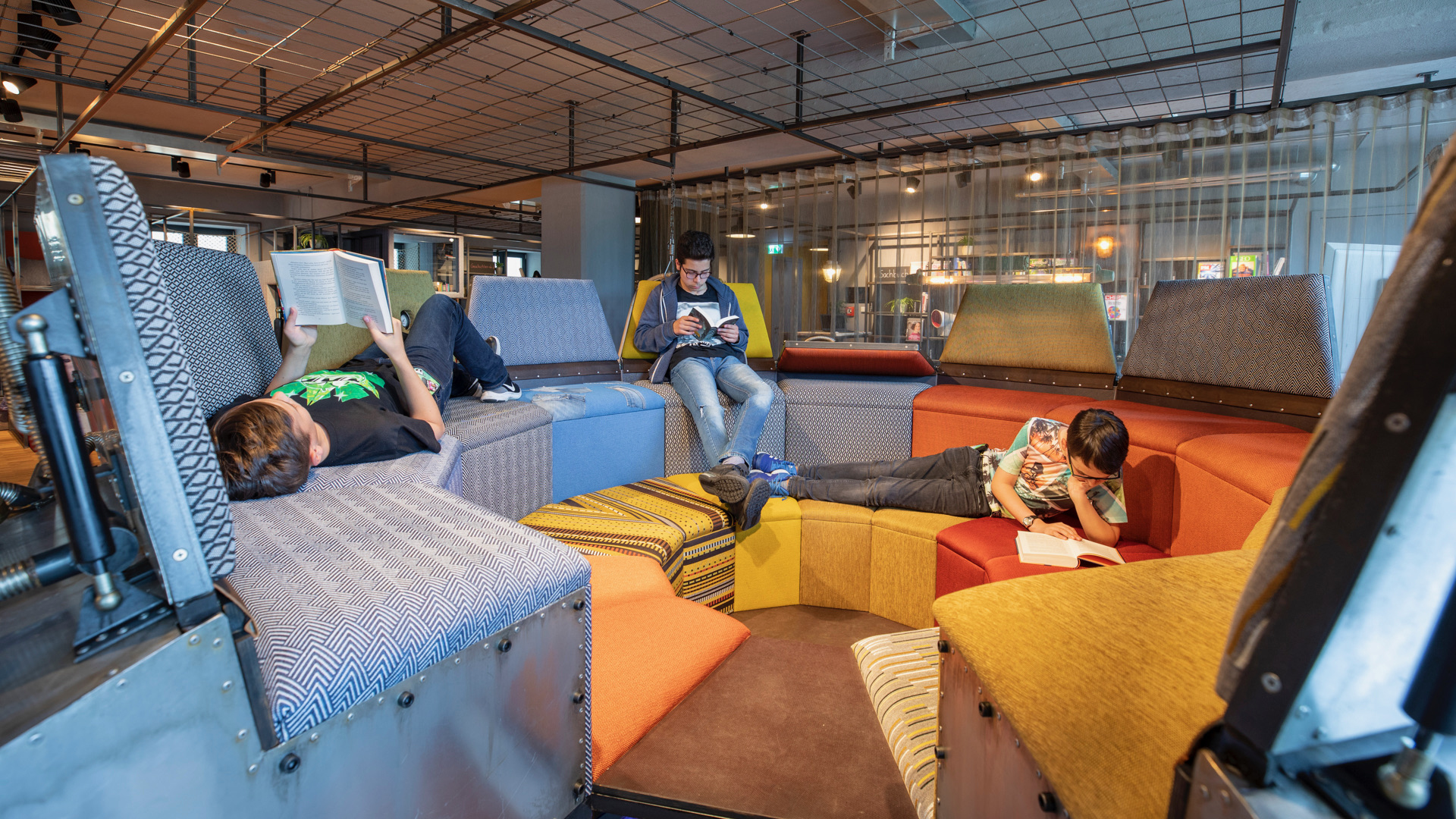 Hubland Library also offers several stages, and a variety of pleasant amenities for visitors such as a coffee zone, a reading table/makerspace, cocoons, a work bar, a space for kids, a kitchen and more. Steadily rooted in its past, Hubland Library is now an inclusive third place floating into the future.