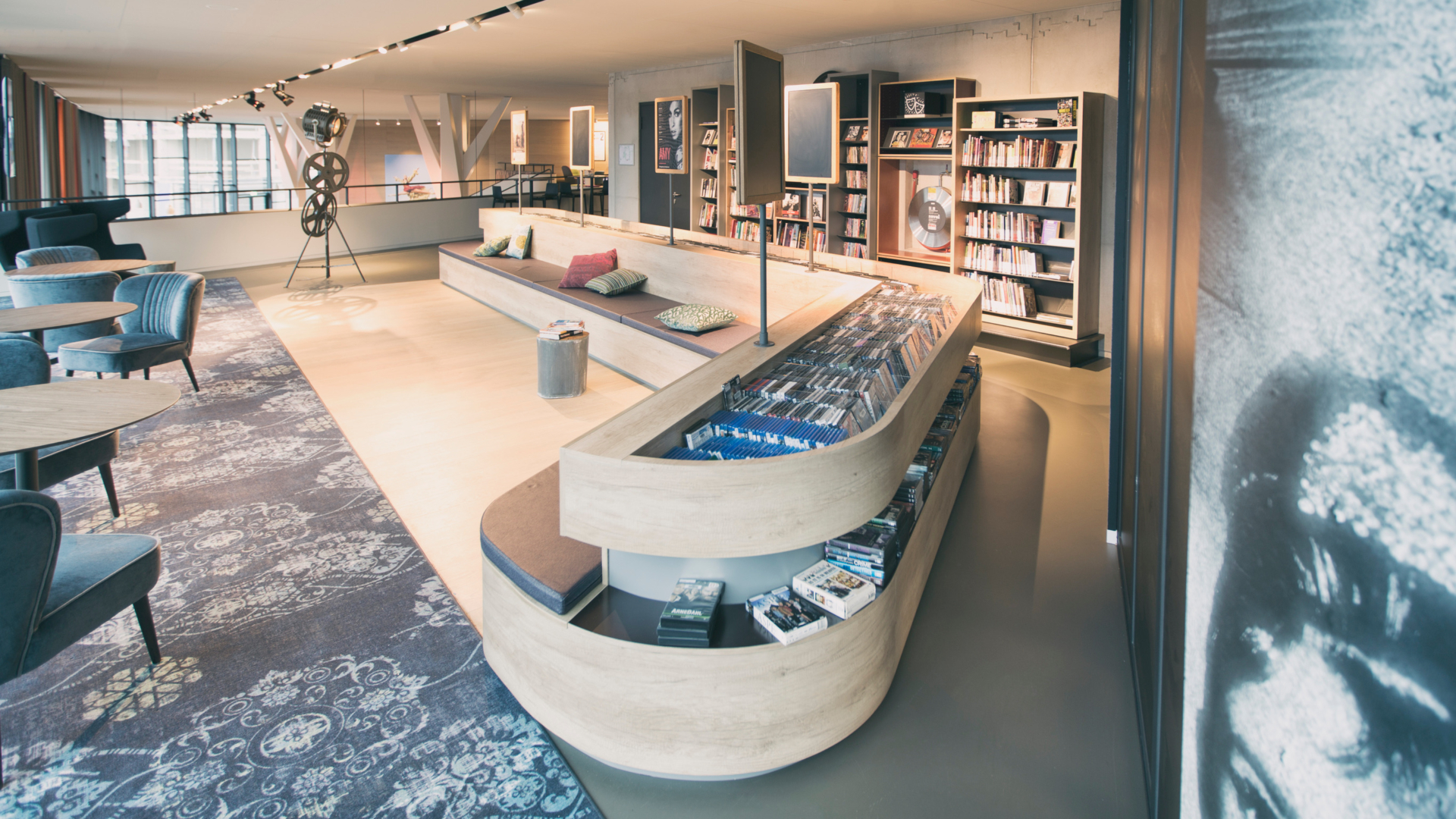 The result? A fusion between an information center and a coffee place where books should not overpower the warm atmosphere. By strategically placing the bookshelves against walls and around the staircases we created space, giving patrons a lot of area to move around in; inviting everyone to explore. Wooden shelves, wood on the walls, wood everywhere helped us create warmth, just like in a living room.