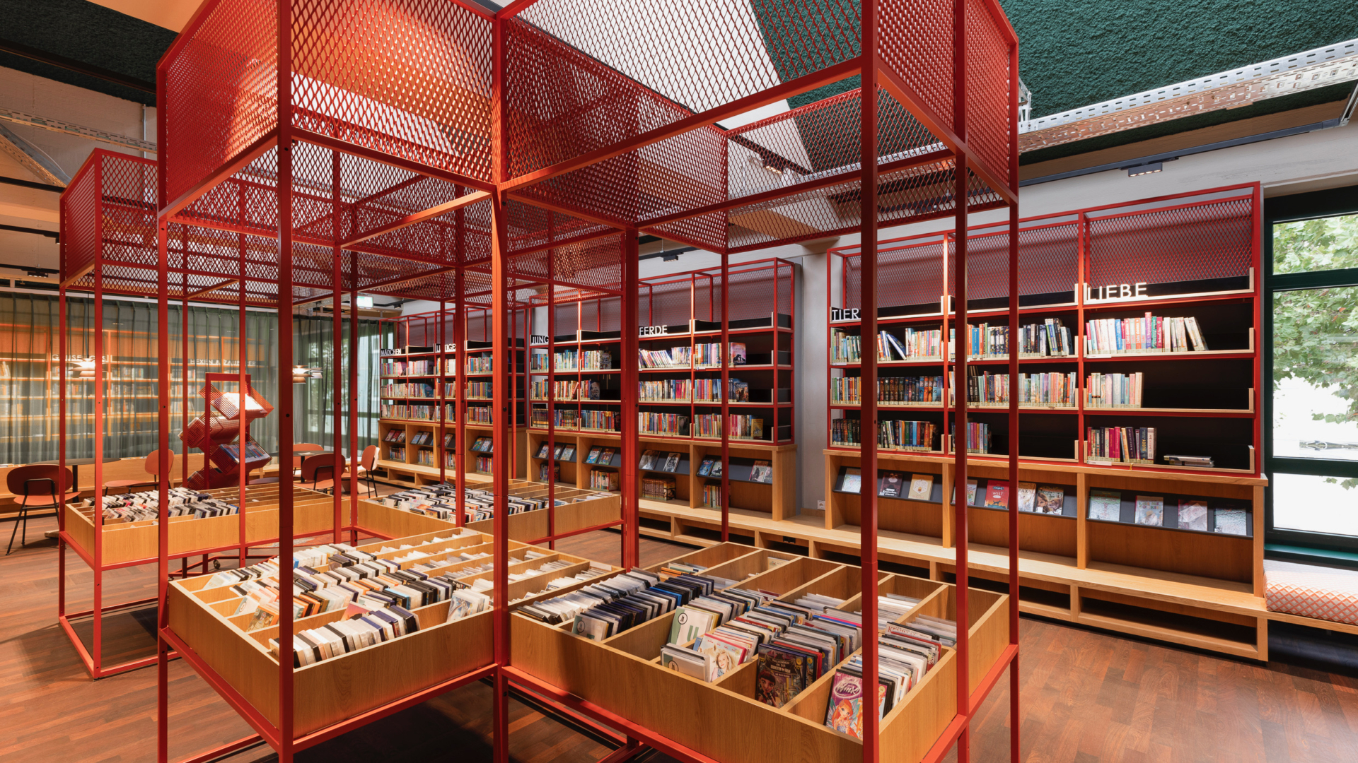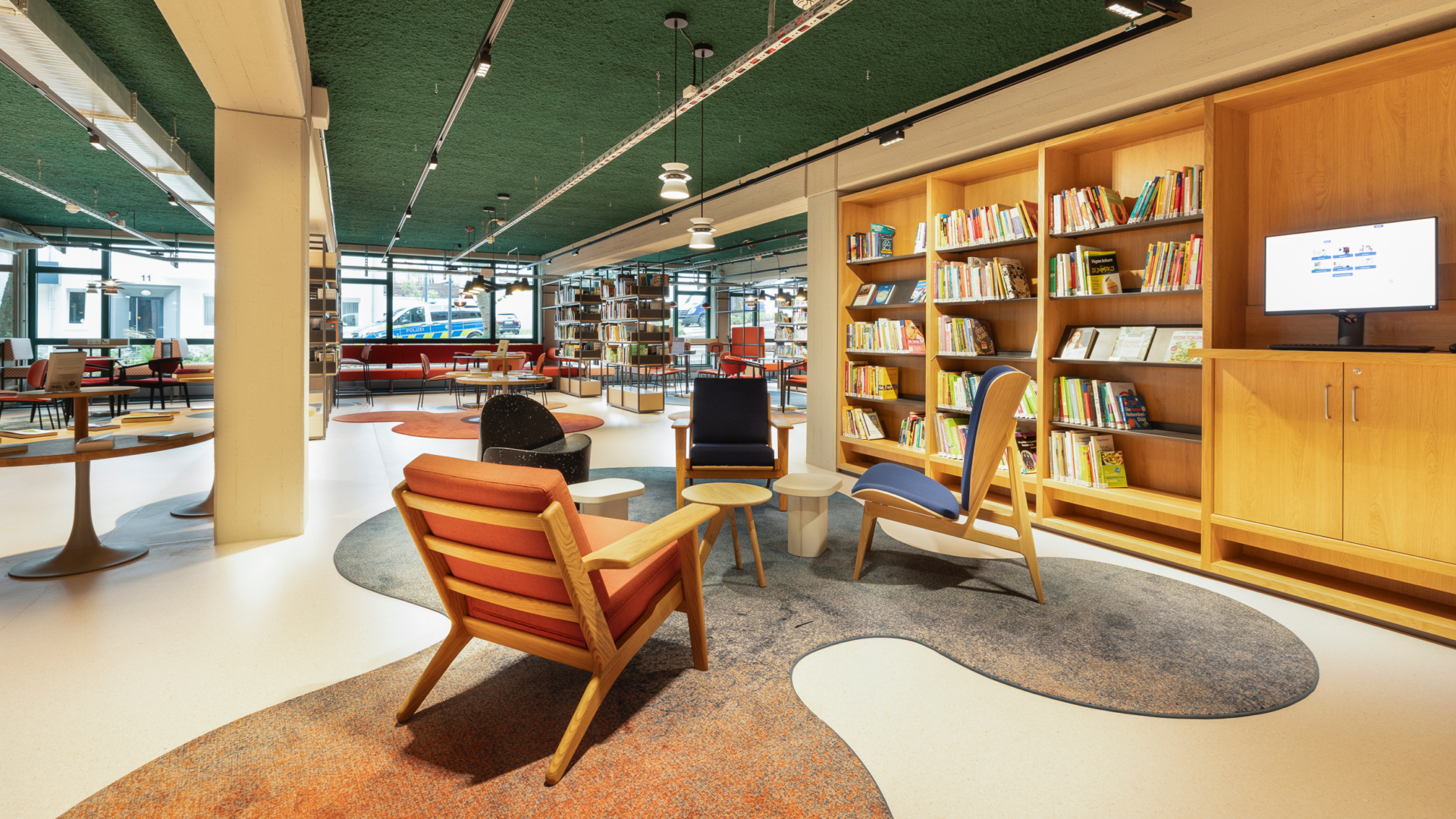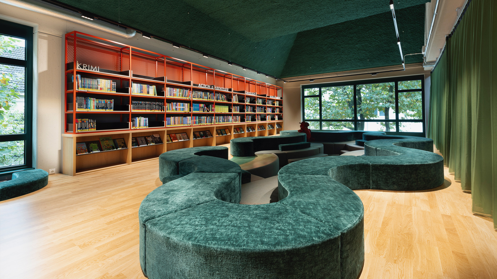 includi’s interior design closely matches the building’s original architecture and identity from the 1980s. This nostalgic ambiance is also recognizable in the mix of distinct furniture and decorative lighting with modernist design classics. Despite its large size, visitors will not easily feel lost in Library Velbert. By playing with strong colors, materials and floor coverings, different zones have been created, each with its own atmosphere.