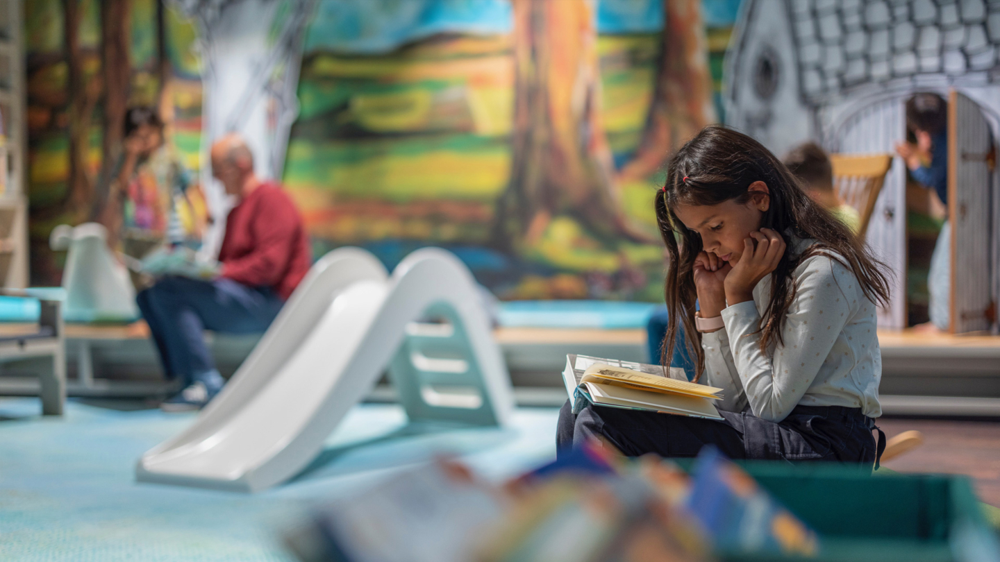 The initial renovation plans were extensively researched by includi. We also identified the remaining missing factors – the basic elements of a “third place library”. This was followed by a Design Workshop with the library team. Together we arrived at a clear positioning and identity of Library Velbert 2.0. We then translated the results of the Design Workshop and a small-scale user survey into a new interior design for the library, spread over three floors. As art director, includi safeguarded the concept and the intended identity during the implementation phase. We paid extra attention to the new Children’s World: an imaginative discovery place for the youngest visitors.